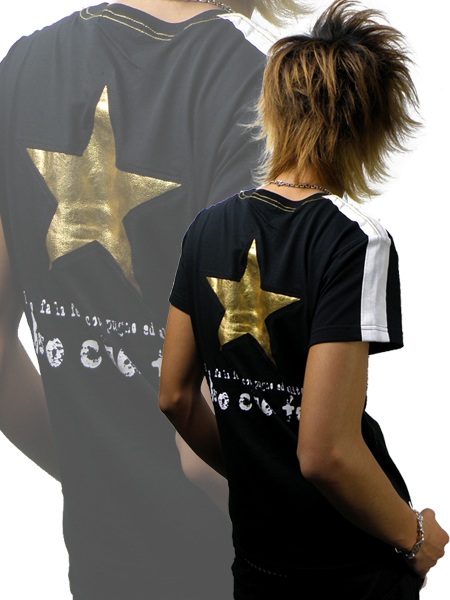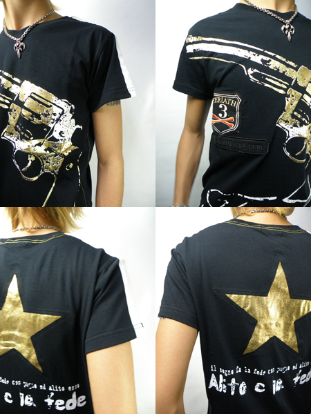 FERIATH(フェリアス)からGUN STAR Tシャツ入荷致しました!!!Frontはプリントの上に割れ箔をプリントを施し、Backには★型の切り抜きを豪快に貼り付け、さらには裏から箔プリントを使用した生地を叩き付け絶妙な仕上がり!!!スタッフオススメITEM!!!オススメ!!!商品画像にてモデルが着用しているボトムはVice Fairy アメリカンギャングパンツになります!!!