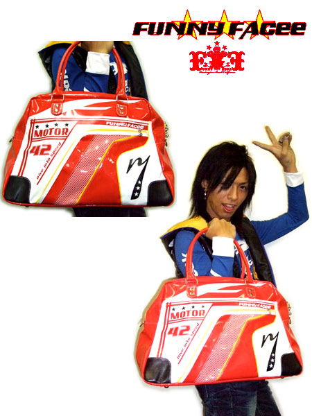 ど派手なレーサーチックのエナメルバッグ。付属のベルトを付ければショルダーにもなります。大きめです 襟にもプリントが入ってます。