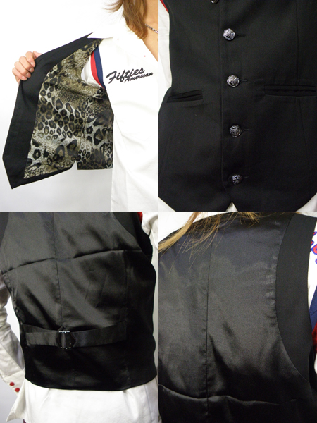 LA GATEの新作ジレベストが当店に入荷致しました。最もトラディショナルなバックサテンに仕上げたこちら、裏地の豹柄はサテン生地を使用し、伊達悪風ながら、どこかアダルトで落ち着いた雰囲気も醸し出す。飾りボタンもヨーロピアンの高級感を与えてくれ