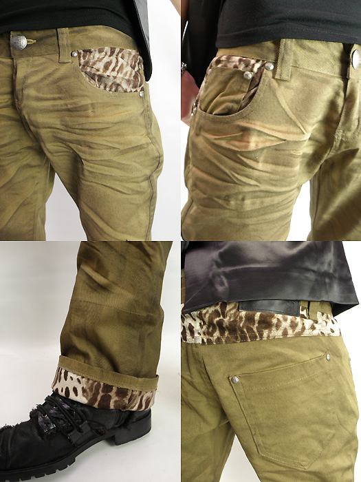 LA GATE(エルエゲート)から切り替え汚しチノパンツ入荷致しました!!!立体ヒゲ加工の上に全体に汚し加工を施し、ハードで男らしい印象のチノパンに仕上がっています!!!切り替えにレオ柄を取り入れ、ワイルドな雰囲気!!!裾を折り返すとレオ柄が覗き、コーデの幅も広がります!!!アメカジスタイルやロックスタイルなどで大活躍の一本です!!!デニムジャケットに合わせてより男らしいスタイルにしてみては!?オススメ!!!