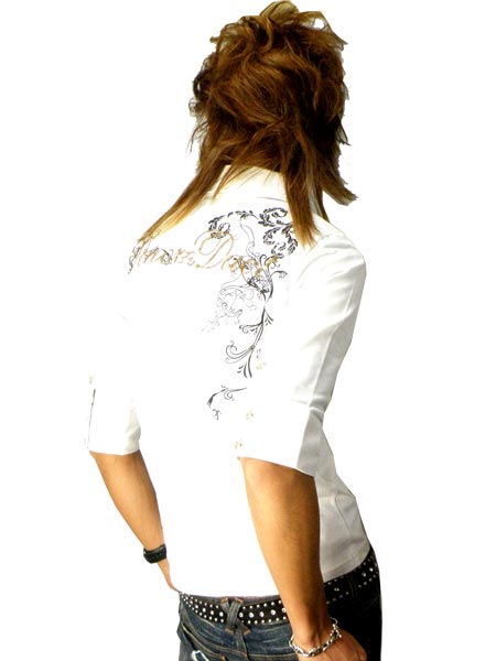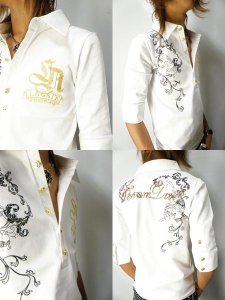 LA GATE(エルエゲート)からS/S新作のVenom 7文袖ポロの登場です!人気シリーズ上位に位置する7文袖ポロ!フロントにはゴージャスなゴールド刺繍が強烈なインパクトを与えている!幻想的に描かれたleafはシンプルなデザインのアクセントに!バックには贅沢に使われたスパンコールがLA GATEらしいゴージャスなイメージを作り出している!襟にはワイヤーが仕込まれており気分に合わせて変形自由自在の優れもの!