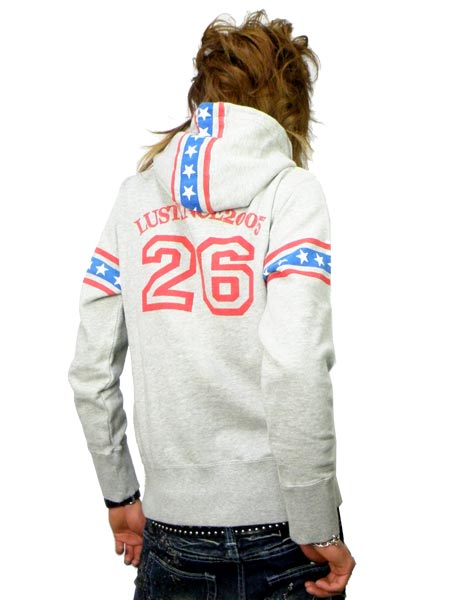 LUST×SANFORDのコラボプルオーバーパーカーになります。 LUSTのPOPな色使いとSANFORDらしいアメカジ系デザインが融合した作品です。 Front,Backの文字はカスレたような独特のプリントをし、両袖、フード部には星のデザインのラインが入っています