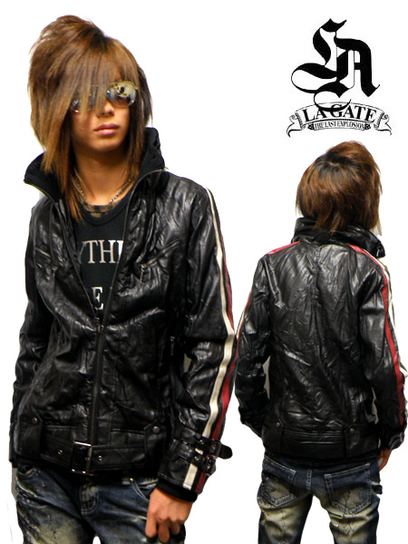 本皮にも引けを取らない上質なPUレザーを使用シワ加工を施したこちらは ZIP、ベルトストラップなどを付けワイルドさを出した逸品! 袖に二本のラインを入れバイカーテイストの雰囲気をプラス! 襟のZIPを開くとW襟になりワイヤーが入っているので様々な表情を楽しめます! 襟、袖、裾にリブを付け防寒性も抜かりなし。
