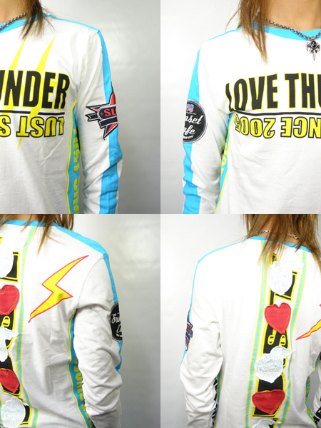 LUST(ラスト)からLOVE THUNDERロンTee入荷致しました!!!とてもLUSTらしいワッペン、プリントを使ったロンTです!!!袖部、脇腹部を配色の切替えにし、POPなカラーリングを演出!!!両袖にワッペンを配置し、BackにはこれぞLUSTと言えるど派手なデザインをプリントとワッペンで仕上げています!!!LUSTからの今春最後ロンTeeになります!!!是非!!!この機会に!!!