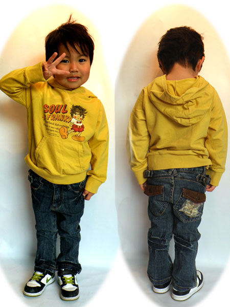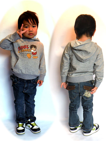 梅田直樹がデザインした子供のデザインをプリントしたかわいいパーカーです。 洗いをかけ、古着風に仕上げました。 今回も大人サイズと同時発売です